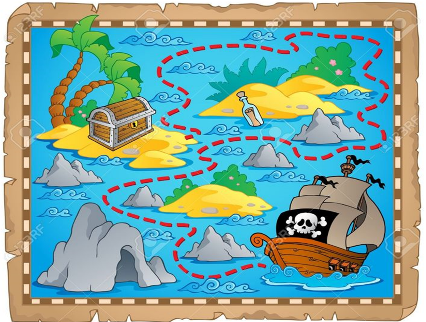 Воспитатель : Ребята мы с вами дали клятву, есть флаг нашего корабля, но мы не знаем куда нам плыть. Где же мы будем искать сокровища? Ведь чтобы найти золото, нам нужна карта, ой, в том письме еще что-то написано! (читает письмо)