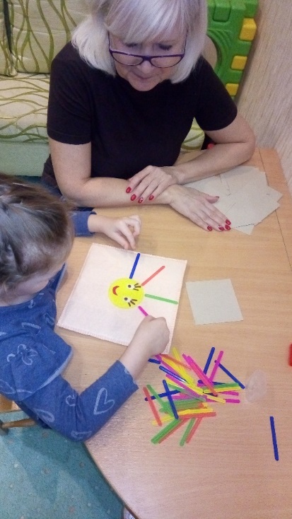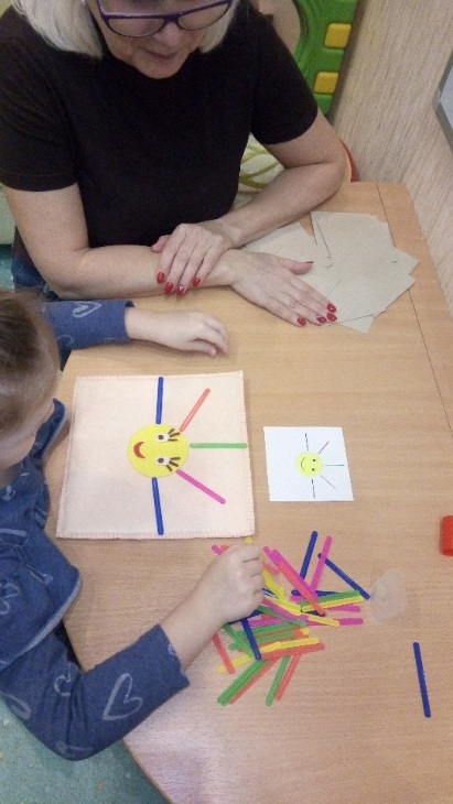 Ребенок самостоятельно подбирает цвета и выкладывает на бланке «солнышко» такой же узор, как на карточке-схема.