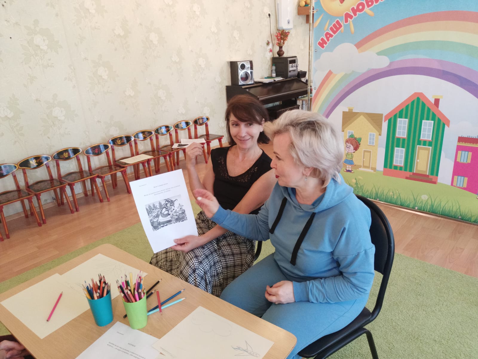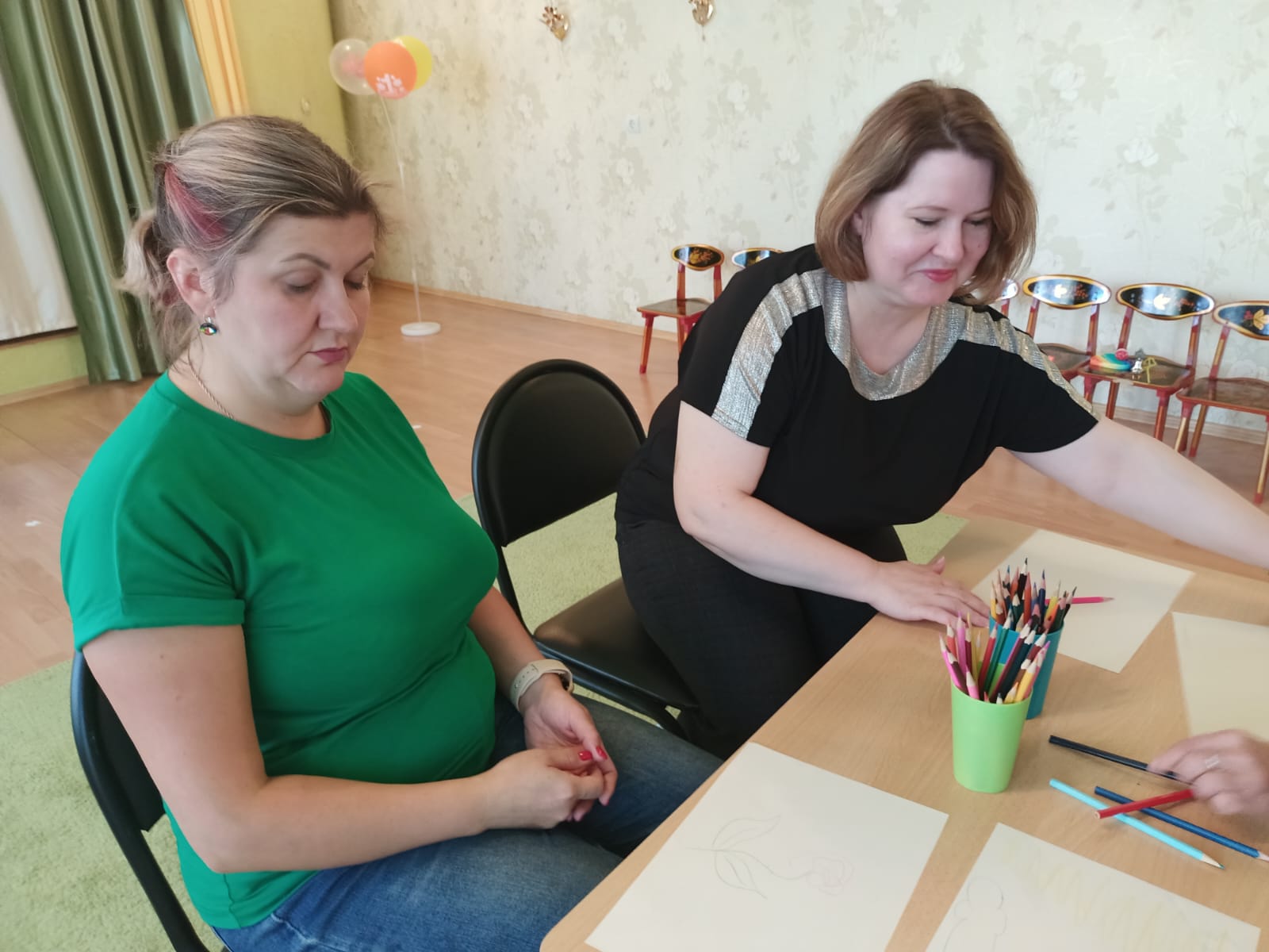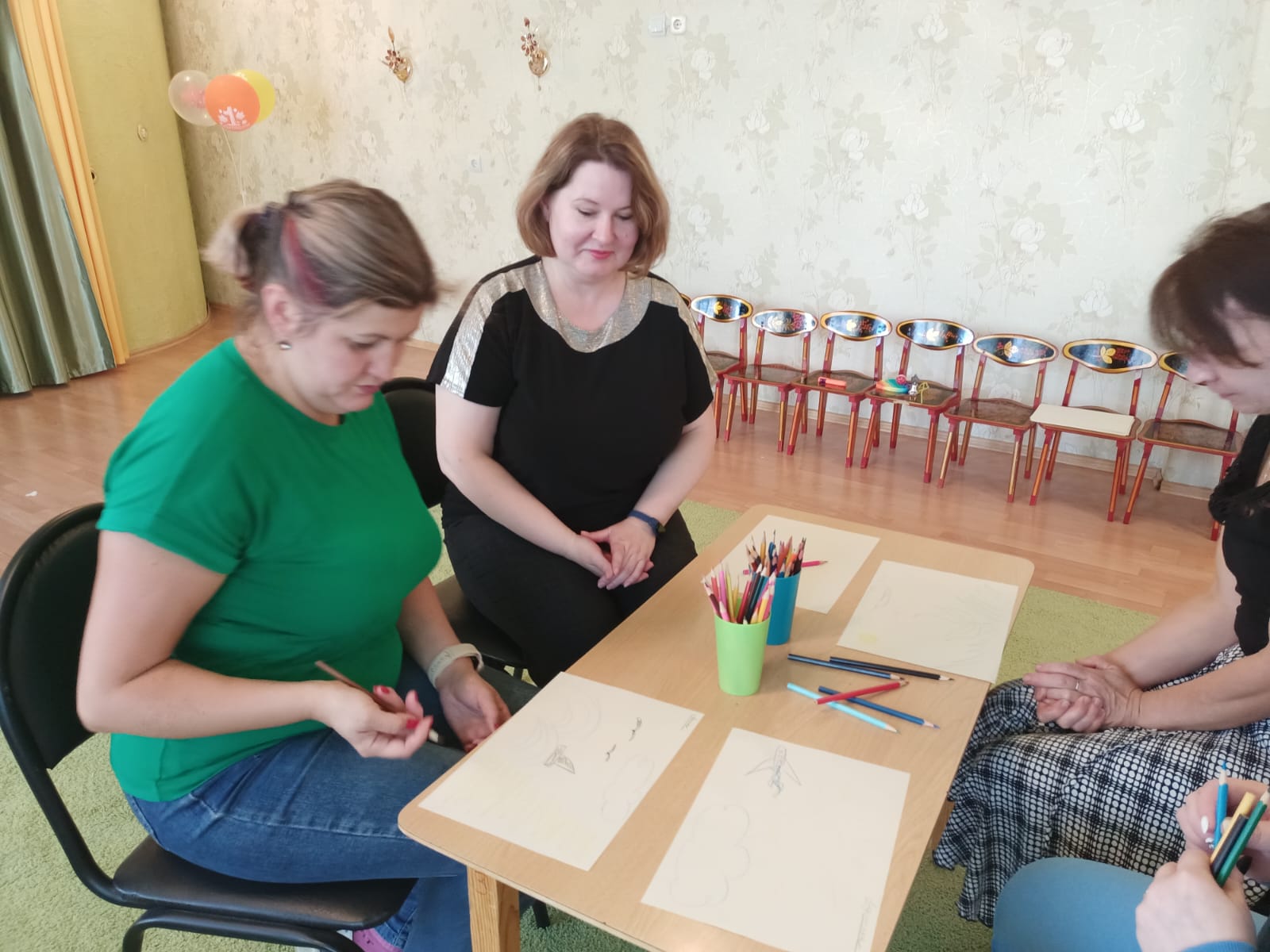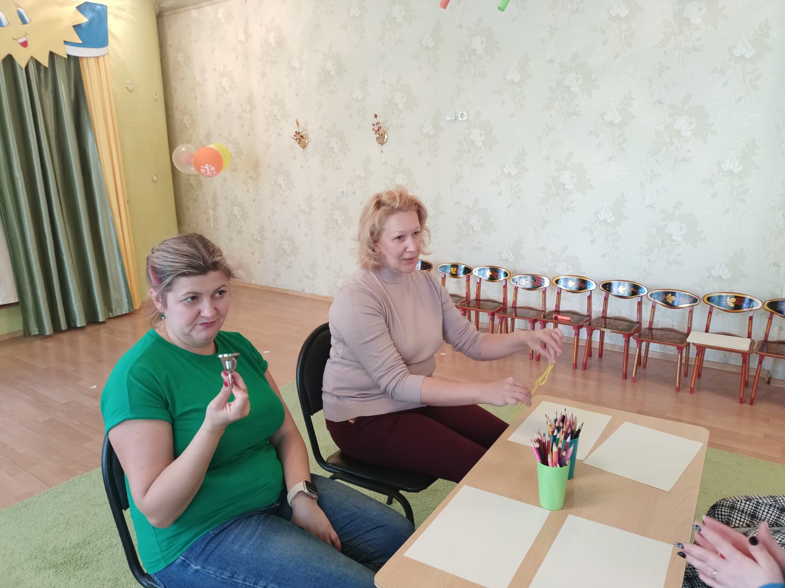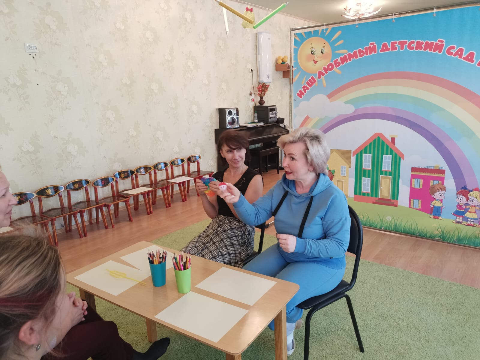 Оборудование: телевизор и ноутбук для демонстрации презентации, столы, стулья, мольберт, магниты, стаканчик из-под йогурта, катушка ниток (пустая), белый лист бумаги А4, маленький мячик, цветной шнурок, прищепка, коктейльная трубочка, крышка от бутылки, маленькое ведерко, ножницы, скотч, бутылочка от йогурта, цветы, клей, листы бумаги А3 для рисования картины, колокольчик, цветная бумага, резинки, фломастеры, игрушка-сердечко, CD-диск, карточки-задания для упражнения «Придумай свой конец сказки», стол для поделок, буклет «Игры и упражнения для развития творческого воображения», музыкальное сопровождение «Играют маленькие волны» композитор Г.В. Свиридов, релаксационная музыка.