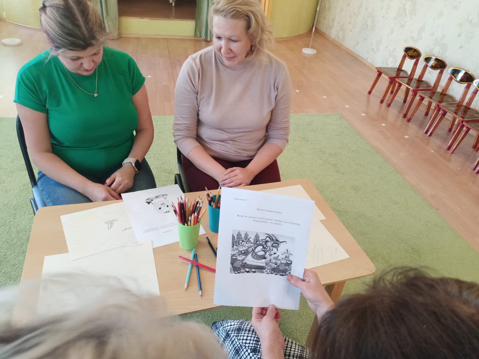 Педагог-психолог: вот перед нами четвертое задание (на экране деталь пазла и название «Сказка ложь, да в ней намек»). Коллеги, хочу предложить вам изменить и сочинить свой конец знакомых сказок. (Предлагаю разделиться на две команды. Каждой команде выдается конверт с заданием по сказкам «Колобок», «Волк и семеро козлят»).