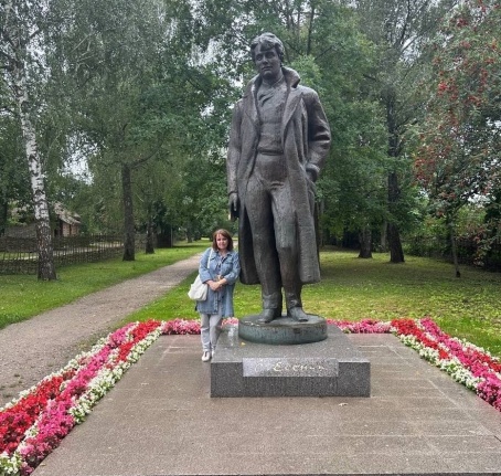 Недалеко от зала, уходя в глубь неба, стоит огромный портрет поэта. Все приезжие любят возле него сфотографироваться на память. А дальше, за портретом, открывается невероятный вид на Оку. Стоя на вершине, всё кажется таким крошечным… Небольшие облака, что лениво плывут по небу, деревья и поле за рекой… Кажется, что сейчас ты спустишься быстро и окажешься на другой стороне реки. Но ступенька за ступенькой, и вот ты уже ничтожно мал по сравнению с простирающейся Окой. Глядя на всё это, начинаешь понимать, почему так красивы стихи поэта. Любуясь такой красотой, строки льются сами собой: