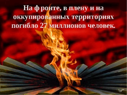 Ведущий 1: За годы Великой Отечественной войны погибло и умерло около 27 миллионов наших соотечественников. Вдумайтесь, каждую минуту погибало 13 человек. Вот она, война!