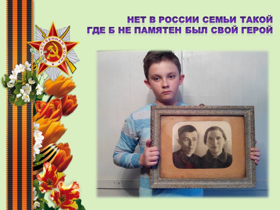 Нет в стране ни одной семьи, которой не коснулась Великая Отечественная война. В каждой семье есть воевавшие и погибшие, угнанные в фашистское рабство и концлагеря, умершие от голода или от ран, погибшие во время блокады Ленинграда, бомбежек, сожженные заживо и замученные в плену. Война – это страшно. Война - это смерть, боль и ненависть. И мы обязаны помнить, мы обязаны научить наших детей помнить и чтить подвиги своих предков, погибших во имя нашей счастливой жизни.