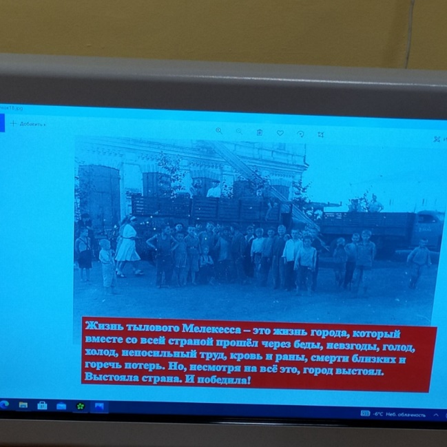 Для детей был организован просмотр онлайн-презентации «Город Мелекесс в годы Великой Отечественной войны». Ребята с удовольствием прослушали рассказ о том, как родной город пережил военные годы в тылу, как жители города трудились на благо победы, как многие предприятия переквалифицировались для того чтобы выпускать снаряды, печь хлеб и производить медицинский инвентарь для фронта. Узнали о том, что в город Мелекесс из Ленинграда была перевезена историческая библиотека с древними книгами, ценными рукописями, дабы уберечь ее от огня войны и сохранить для потомков. Узнали о бессмертном подвиге нашего земляка, Александра Матросова.