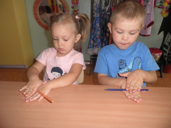 Задание – нужно перевернуть карандаш и с помощью этого переворота вложить его в другую руку свободным концом. Затем новый поворот – и снова карандаш возвращается к ведущей руке. Сделать несколько таких поворотов – как будто катится колесо. При вращении карандаш «смотрит» в направлении от груди вперед.