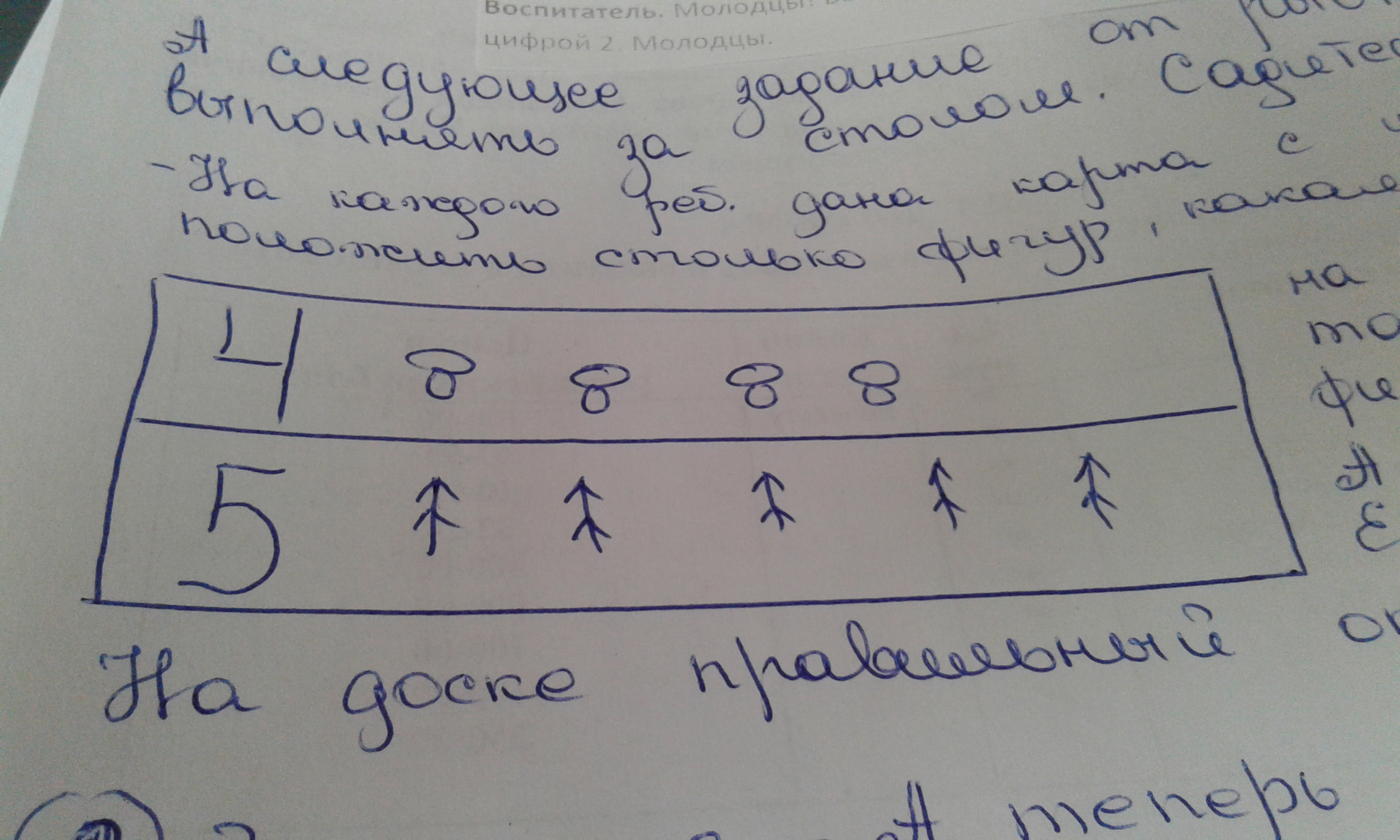 Задание 2.Дети, новое задание от рыбки. Я вам раздаю каждому карточку. какие цифры вы на ней видите? Вам надо в ряд цифры 4положить ровно столько грибочков , а в ряд цифры 5 разложим ёлочки, будьте внимательные.