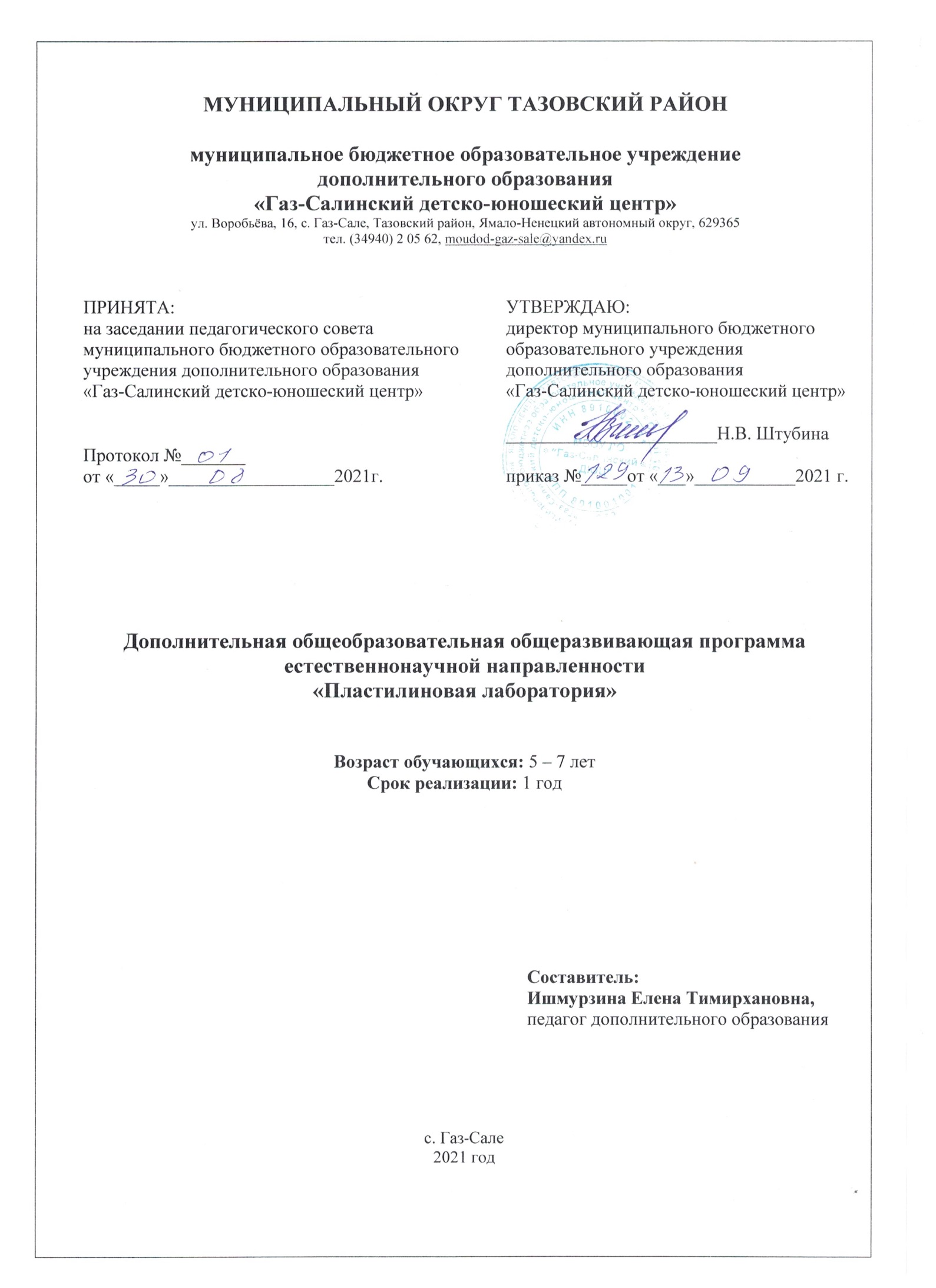 «Санитарно-эпидемиологические требования к организациям воспитания и обучения, отдыха и оздоровления детей и молодежи»; Приказа Минпросвещения России от 09.11.2018 № 196 «Об утверждении Порядка организации и осуществления образовательной деятельности по дополнительным общеобразовательным программам», Письма Минобрнауки РФ от 11.12.2006, № 06-1844 «О примерных требованиях к программам дополнительного образования обучающихся»; муниципальных правовых актов; Устава МБОУ ДО «Газ-Салинский ДЮЦ»; Лицензии на образовательную деятельность № 2601 от 30.05.16г., серия 89 Л01 № 0001194.