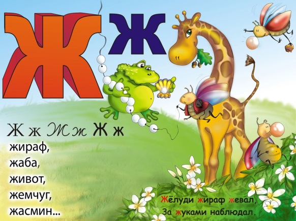 На какое насекомое похожа буква Ж? (слайд буква ж, похожая на жука) Да, и при этом, точно жук, издаёт жужжащий звук [ж].