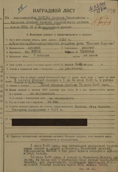«Разрывная пуля попала в сонную артерию Носкова. Жизнь офицера была спасена героическим подвигом, самопожертвованием красноармейца, скончавшегося на руках майора», – указано в донесении. Курсанта похоронили в братской могиле в селе Мешковичи.[3] Указом Президиума Верховного Совета СССР от 24 марта 1945 года красноармейцу Алексею Носкову было посмертно присвоено звание Героя Советского Союза. Память о герое бережно хранят не только в его родном Красноперекопском районе, где в 1965 году улица Ветошная была переименована в улицу Носкова, но и в школе № 40, где открыт мемориал в его честь."