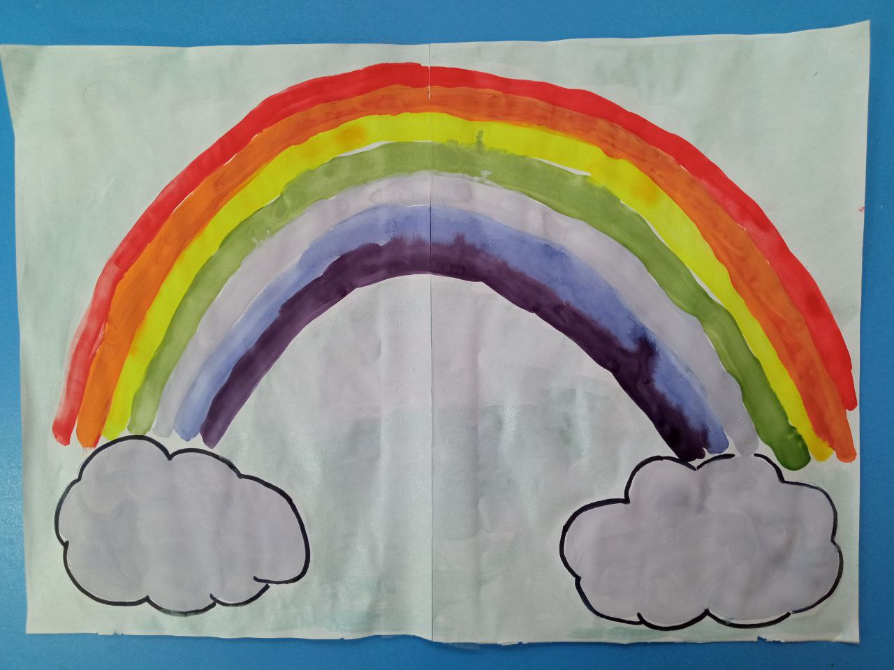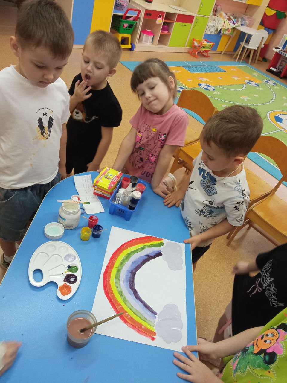 заключении педагог побуждает детей ещё раз, назвать какие они взяли краски, какие выполняли действия, какой получился новый цвет и после этого на ватмане появляется коллективная работа. Работа помещается на видное место в группе.