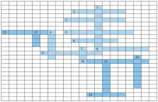 По горизонтали: 2. Лицо, находящееся вне транспортного средства на дороге и не производящее на ней работу (Пешеход). 3. Техническое средство со световыми сигналами, регулирующее дорожное движение (Светофор). 5. Транспортное средство, приводимое в движение мускульной силой человека (Велосипед). 6. Полоса земли, обустроенная для движения транспортных средств (Дорога). 8. Часть дороги, предназначенная для движения пешеходов (Тротуар). 9. Лицо, управляющее каким-либо транспортным средством (Водитель). 10. Человек, контролирующий безопасность дорожного движения (Инспектор). 11. Изгиб дороги (Поворот). 13. Денежное взыскание за нарушение правил дорожного движения (Штраф). По вертикали: 1. Важнейшее условие пребывания человека на дороге (Безопасность). 4. Одно из необходимых средств дорожного сервиса (Телефон). 7. Предупреждающий знак вблизи детского учреждения (Дети). 12. Тот, кто совершает поездку в транспорте (Пассажир). 14. Стоящий на посту (Постовой). 15. Устройство для управления движущейся машиной (Руль).