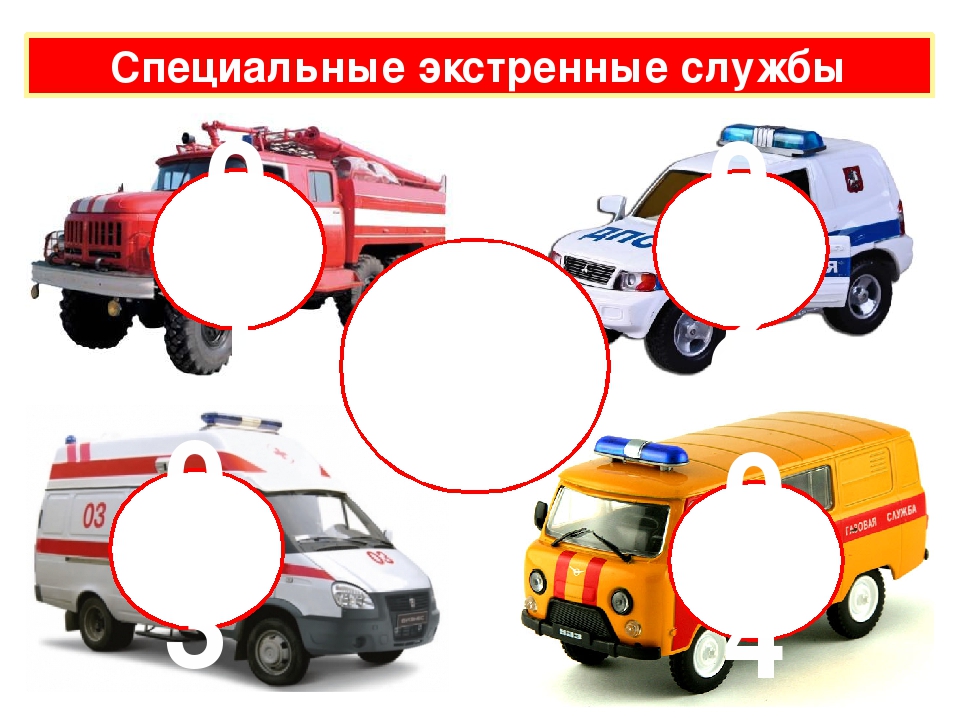 («Пожарная машина», «Полицейская машина», «Скорая помощь», «Аварийная газовая служба»).