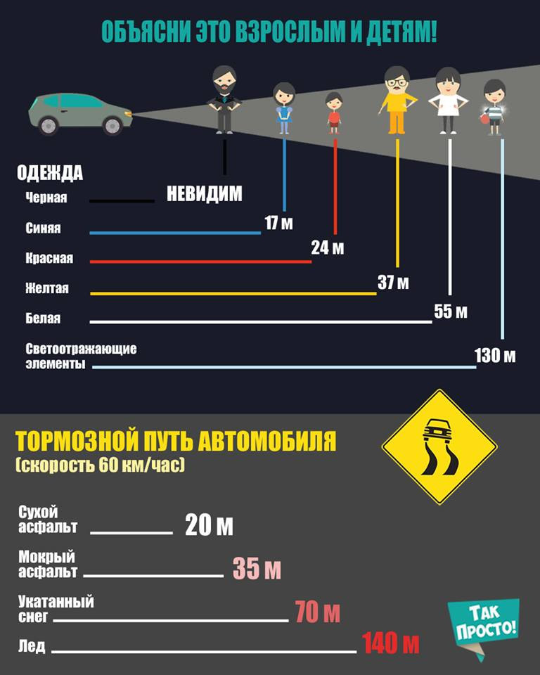 Зимой день короче. Темнеет рано и очень быстро. В сумерках и в темноте значительно ухудшается видимость. В темноте легко ошибиться в определении расстояния как до едущего автомобиля, так и до неподвижных предметов. Часто близкие предметы кажутся далекими, а далекие близкими. Случаются зрительные обманы: неподвижный предмет можно принять за движущийся, и наоборот. Поэтому в сумерках надо быть особенно внимательными. Носите одежду со световозвращающими элементами (нашивки на курточке, элементы рюкзака), что позволит водителю с большей вероятностью увидеть вас в темное время суток.