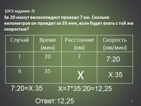 За 20 минут велосипедист проехал 7 км. Сколько километров он проедет за 35 мин, если будет ехать с той же скоростью?