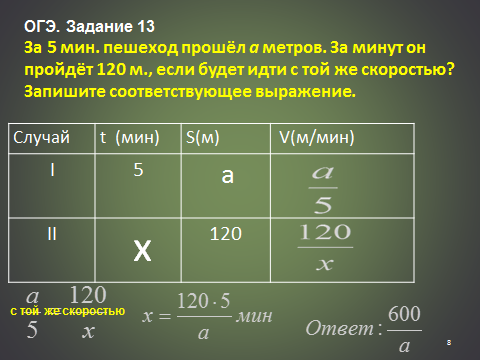 (ОГЭ. Прототип задания 13). За 5 мин. пешеход прошёл a метров. За сколько минут он пройдёт 120 м., если будет идти с той же скоростью? Запишите соответствующее выражение.