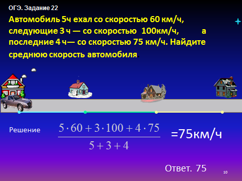 (Слайд10) Задача на определение средней скорости движения тела, если путь состоит из нескольких участков. У доски работает ученик.