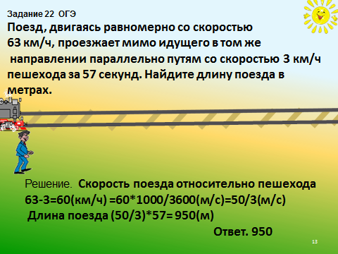 Вывод: поезд проходит мимо движущегося в том же направлении человека расстояние, равное длине поезда, со скоростью равной разности скорости поезда и движущегося человека.