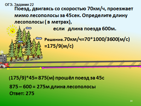 (ОГЭ. Прототип задания 22). Поезд, двигаясь со скоростью 70км/ч, проезжает мимо лесополосы за 45сек. Определите длину лесополосы ( в метрах), если длина поезда 600м.