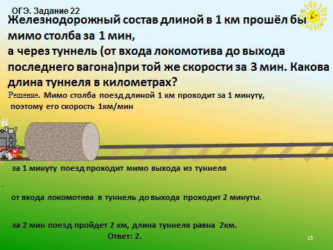 3)Дополнительная задача. Железнодорожный состав длиной в 1 км прошёл бы мимо столба за 1 мин, а через туннель (от входа локомотива до выхода последнего вагона) при той же скорости за 3 мин. Какова длина туннеля в километрах