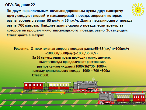 Решение. Относительная скорость поездов равна 65+35(км/ч)=100км/ч =100000/3600(м/с)=1000/36(м/с)
