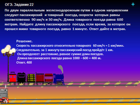 (ОГЭ. Прототип задания 22). По двум параллельным железнодорожным путям в одном направлении следуют пассажирский и товарный поезда, скорости которых равны соответственно 90 км/ч и 30 км/ч. Длина товарного поезда равна 600 метрам. Найдите длину пассажирского поезда, если время, за которое он прошел мимо товарного поезда, равно 1 минуте. Ответ дайте в метрах.