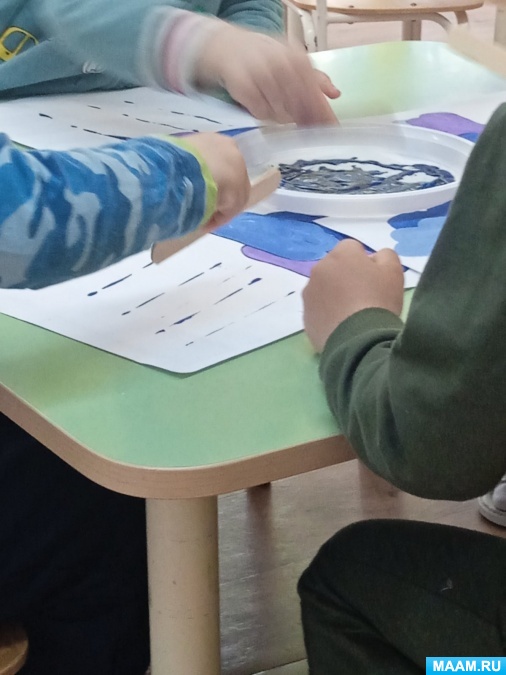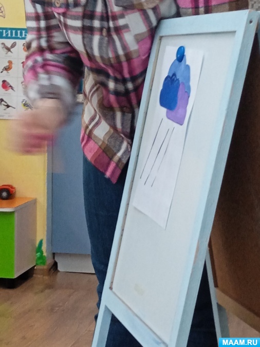 Материалы и оборудование: альбомные листы формата А4 на каждого ребенка с изображение туч, баночки с водой, гуашь, выложенная в широкую тарелку, деревянные палочки на каждого ребенка, влажные салфетки, игрушка Лягушка.