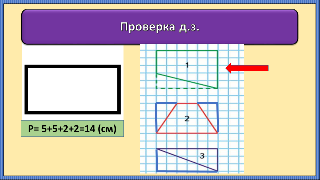 Собирают слово – «геометрия» из слогов. Сообщение | 1.Дети проверяют д.з. 2. Дети вспоминают определение и свойства прямоугольника. 3.Работают по карточкам, выполняя уравнения, задачи и примеры 4.Работа парами под руководством учителя. (Сообщение о слове – геометрия) |