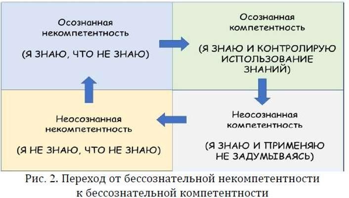 Этот четырехступенчатый процесс представляет собой переход от бессознательнойнекомпетентностик бессознательнойкомпетентности.