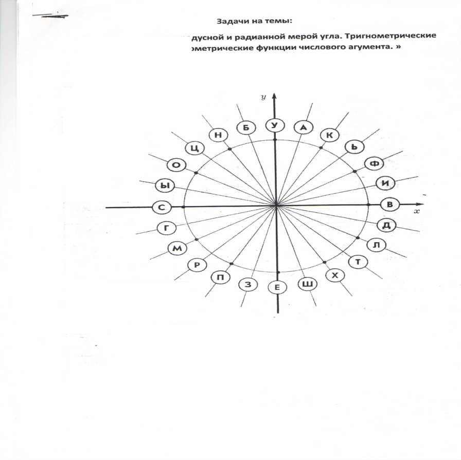 (слайд №2) Работа индивидуально (слайд №3) (слайд №4) (слайд №5) (слайд №6) (слайд №7) | - Сегодняшний урок я хочу начать словами французского философа (1712-1778гг.): «Вы талантливые дети! Когда – нибудь вы сами приятно порадуетесь, какие вы умные, как много и хорошего умеете, если будете постоянно работать над собой, ставить новые цели и стремиться к их достижению…». Я желаю вам уже сегодня на уроке убедиться в этих словах. - Для того чтобы узнать кому принадлежат эти слова предлагаю выполнить следующее задание. Единичная окружность разделена на 24 равные части. Найдите точки с соответствующими буквами, которые являются результатами поворота начальной точки В на указанные в таблицах углы. Заполните таблицу буквами. Задание. Единичная окружность разделена на 24 равные части. Найдите точки, соответствующие результатам поворота начальной точки В на указанные в таблицах углы. Учитывая полученные результаты и данные обозначения точек, заполните таблицу буквами.