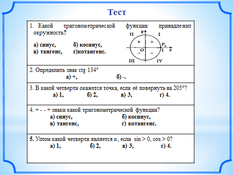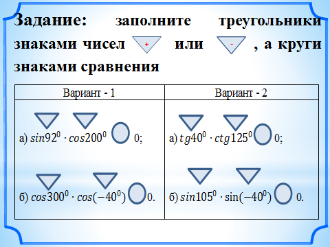 (В какой координатной четверти лежит угол? Какой знак имеет синус (косинус, тангенс, котангенс) в данной четверти.) Как определить знак синуса, косинуса, тангенса и котангенса при заданном значении угла. | Слушают разъяснения, делают записи в тетрадях. Отвечают на вопросы. Синус, косинус, тангенс и котангенс в первой четверти имеют знак «+» Выступает представитель от каждой группы и выставляют баллы в лист самооценки. З Слушают разъяснения. Отвечают на вопросы. 1. Определить какой координатной четверти принадлежит угол. 2. Выяснить знак синуса, косинуса, тангенса и котангенса угла α в данной четверти. | |||||||||||||||||||||||||||||||||||||||||||||||||||