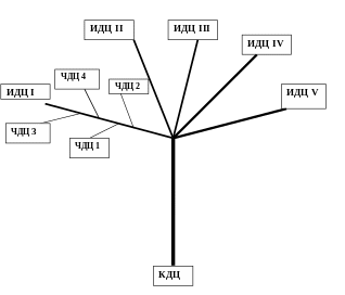 В основе любой модульной программы лежитсовокупность целей. Составление модульной программы всегда начинается с выделения основных научных идей курса, внутри которых формулируются цели изучения тем и отдельных уроков. Лишь затем учебное содержание структурируется вокруг этих идей в определенные блоки. Совокупность целей модульной программы можно представить в виде дерева. Ствол дерева по содержанию соответствует отдельной теме, для которой формулируетсякомплексная дидактическая цель (КДЦ). Стволовые ветви соответствуют отдельным урокам, к каждому из которых формулируются интегрирующие дидактические цели (ИДЦ). Модульные уроки подразделяются на учебные элементы (УЭ) или этапы урока. Отличительной особенностью модульной технологии является то, что для каждого учебного элемента разрабатываются своичастные дидактические цели (ЧДЦ) (рис. 2).