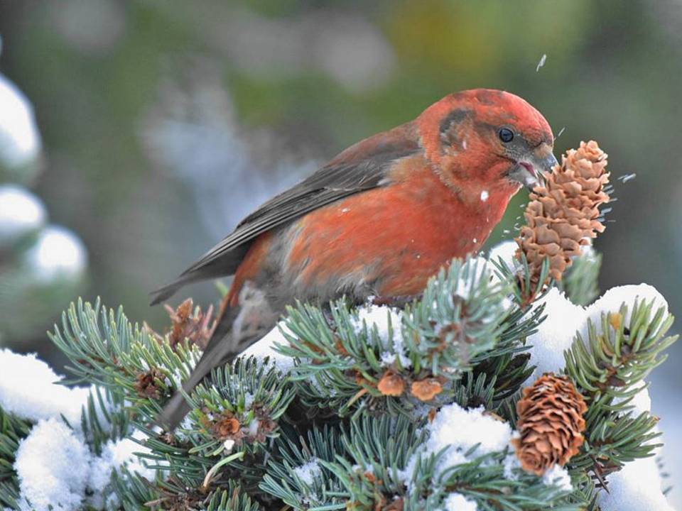 – Есть в лесу удивительная птица, которая тоже очень любит грызть шишки. Посмотрите на экран, чтобы удобнее было доставать из шишек семена, клювик у неё на кончиках перекрещивается, поэтому птицу назвали – клёст.