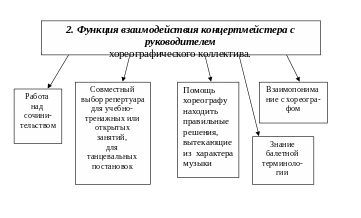 5. Рассмотрев функцию взаимодействия концертмейстера с руководителем хореографического коллектива, выявилась главная параллель: оба специалиста находятся в едином творческом процессе. Для качественного осуществления этого процесса концертмейстеру необходим целый комплекс знаний и умений, касающихся музыкальной и хореографической сферы. Не менее важно взаимопонимание с хореографом.