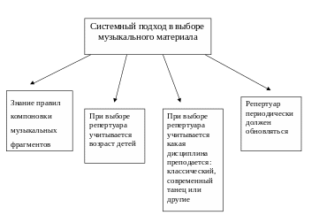 Главнейшей задачей концертмейстера является, конечно, подбор музыкального репертуара, создание музыкальной атмосферы занятия, ведь музыка помогает понять эмоциональную подоплеку танцевальных движений, сделать их более выразительными. За многие годы работы автором данного исследования накоплен большой «музыкальный багаж». Диапазон музыкальных возможностей очень широк – от фрагментов балетных до оперных и оперетточных, от сочинений, написанных специально для детей, до сложных образцов фортепианной музыки. «Но для меня очень важно, каждый раз, выбирая музыку, четко и конкретно представлять себе, насколько уместен данный материал для будущего упражнения или танца.