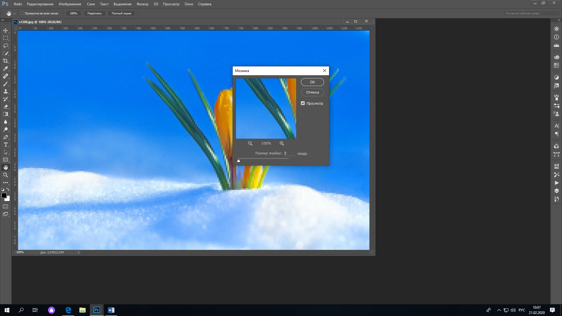 3. Измените размер клеток до 5 и щелкайте OK. Картинка как бы разбилась на маленькие квадратики (пиксели), отличающиеся по цвету.