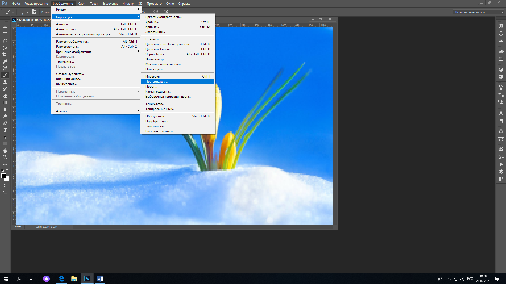 4. Щелкните ИЗОБРАЖЕНИЕ – КОРРЕКЦИЯ - Постеризация. Изменяйте значения от 5 до 20. Выберите самое низкое значение, когда картинка еще остается качественной. Чем ниже это число, тем меньше цветов будет использоваться в работе, но тем больше погрешность в передаче цвета.