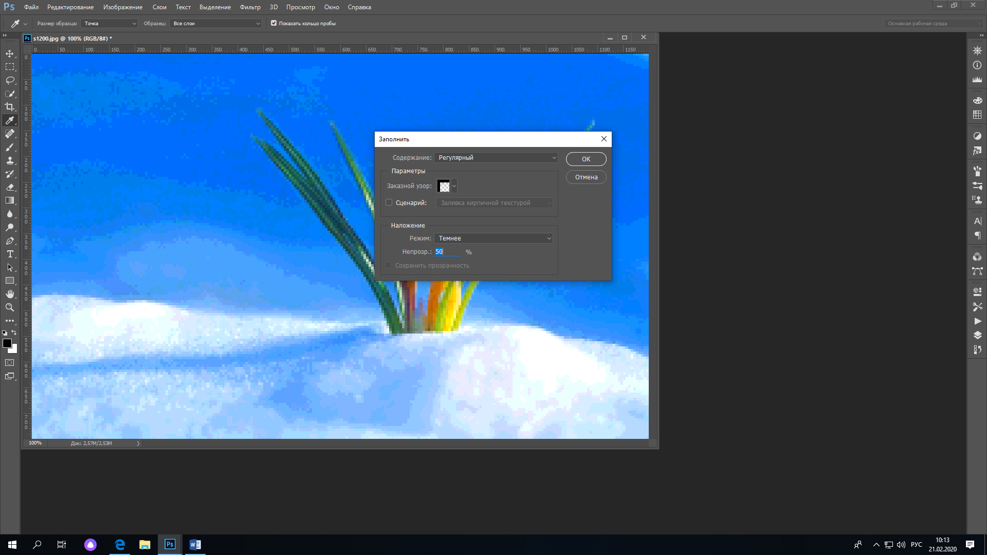8. Вернемся назад к нашей фотографии. Нажмите РЕДАКТИРОВАНИЕ > ВЫПОЛНИТЬ ЗАЛИВКУ/ В открывшемся окошке выбираем наш узор (он самый последний в списке) и нажимаем ОК