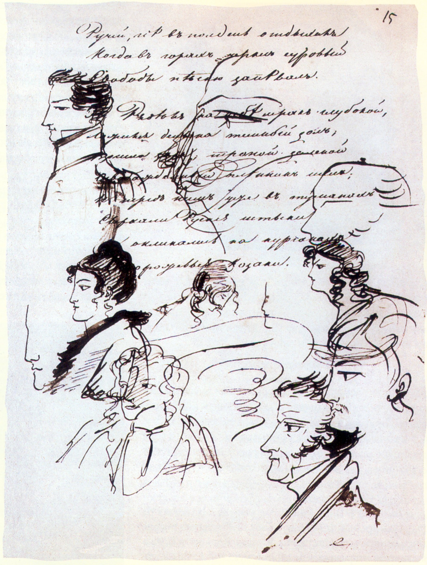Взгляните на эти листы. Перед вами воспроизведения черновых тетрадей поэта. Как они разнообразны, как живописны. Быстрый стремительный почерк. Строчки бегут одна за другой. Некоторые слова не дописаны. Очень многое зачеркивается – найдены другие слова, более точные и выразительные. Рядом с текстом, а иногда в самом тексте, разбросаны рисунки. Вот Пушкин перестал писать, задумался, а рука его рисует чей-то профиль, пейзаж, женскую голову. Эти рисунки как бы авторский комментарий к творчеству и биографии поэта.