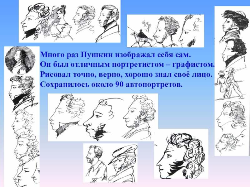 -Много раз Пушкин изображал себя сам. Сохранилось около 90 его автопортретов. Он был блестящим портретистом-графистом. Рисовал точно, верно, несколькими штрихами, передавая (несколькими) самое характерное, самое главное, хорошо знал свое лицо.