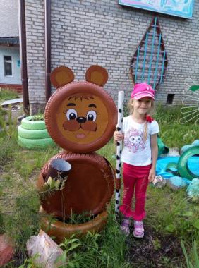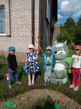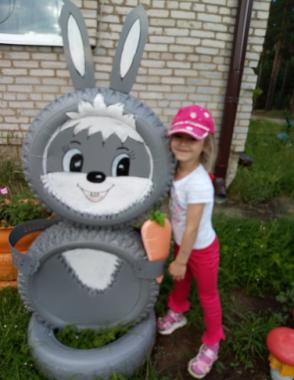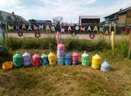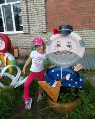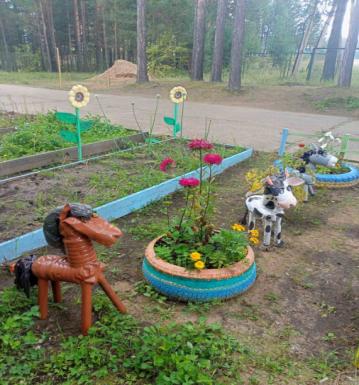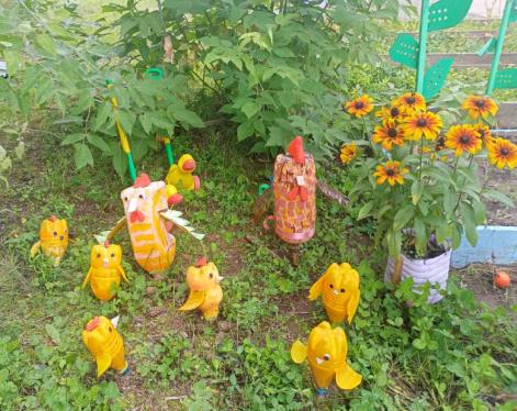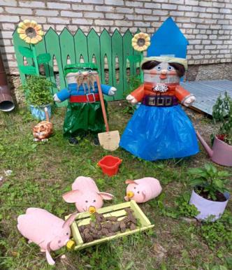 В августе мы силами родителей 1 младше группы закончили оформление деревенского дворика «В гостях у бабушке». Для формирования у детей представления о домашних животных, обогащения представлений о приспособленности домашних животных к среде обитания, их связи с человеком (польза, забота человека о домашних животных ). Все персонажи сделаны из бросового материала, тем самым показывая детям на своем примере, как можно дать вторую жизнь мусору, тем самым оберегая планету.