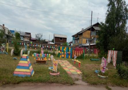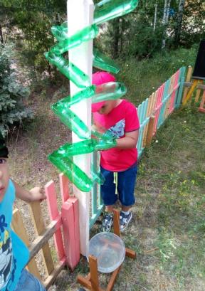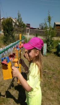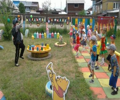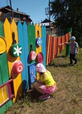 В июне, на месте заброшенного участка оборудовали музыкальную площадку «Шумел-ка», целью которой было улучшение экологического и эстетического состояния игровой площадки. Рационально ее использовать в соответствии с воспитательно-образовательными задачами, разнообразив музыкальную жизнь в летний период, повысить интерес к музыке, формировать потребность в самостоятельной игре на детских шумовых музыкальных инструментах. Ставить спектакли, изучать игру на самодельных музыкальных инструментах будет интересно детям разного возраста, в том числе детям с ограниченными возможностями здоровья. В ее состав вошли нестандартные музыкальные инструменты, изготовленные из домашней утвари, вышедший из употребления. На стойке расположилась «Музыкальная погремушка» состоящая из разных металлических предметов, «Барабанная установка», «Музыкальная стена», с разнообразными гремелками и шумелками, «Деревянный ксилофон», «Музыкальный городок», сделан из больших пластиковых бутылок для кулера. «Детский танцпол» - в танцах дети удовлетворяют свои потребности в движении, это всегда весело и поднимает настроение. Летом дети очень любят играть в театральные игры, для этого отведено специальное место «Театральный уголок».