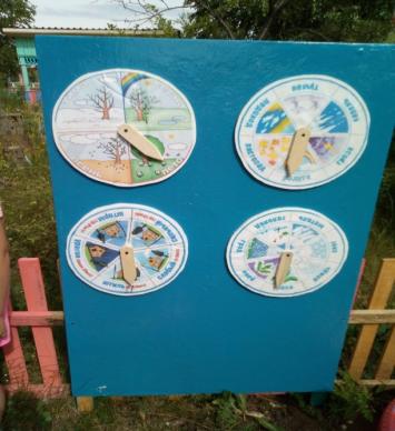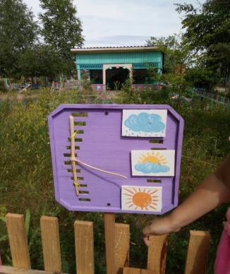 В июле, было решено оборудовать метеостанцию «Капитошка» , она является важной составной частью работы по экологическому воспитанию дошкольников. Она дает возможность познакомить детей с основными стандартными метеорологическими приборами, с методикой и техникой наблюдений и обработки их результатов. Метеостанция обеспечивает проведение наблюдений, практических работ, наблюдения за погодой, сезонными явлениями в окружающей природе, а также изучение микроклимата территории детского сада. Для наблюдения за погодой использованы традиционные приборы (компас, термометр) и приборы, изготовленные из подручного материала совместно с детьми и родителями (дождемер, гигрометр, ветряной рукав, барометр, солнечные часы). Все показания приборов фиксируются на доске.