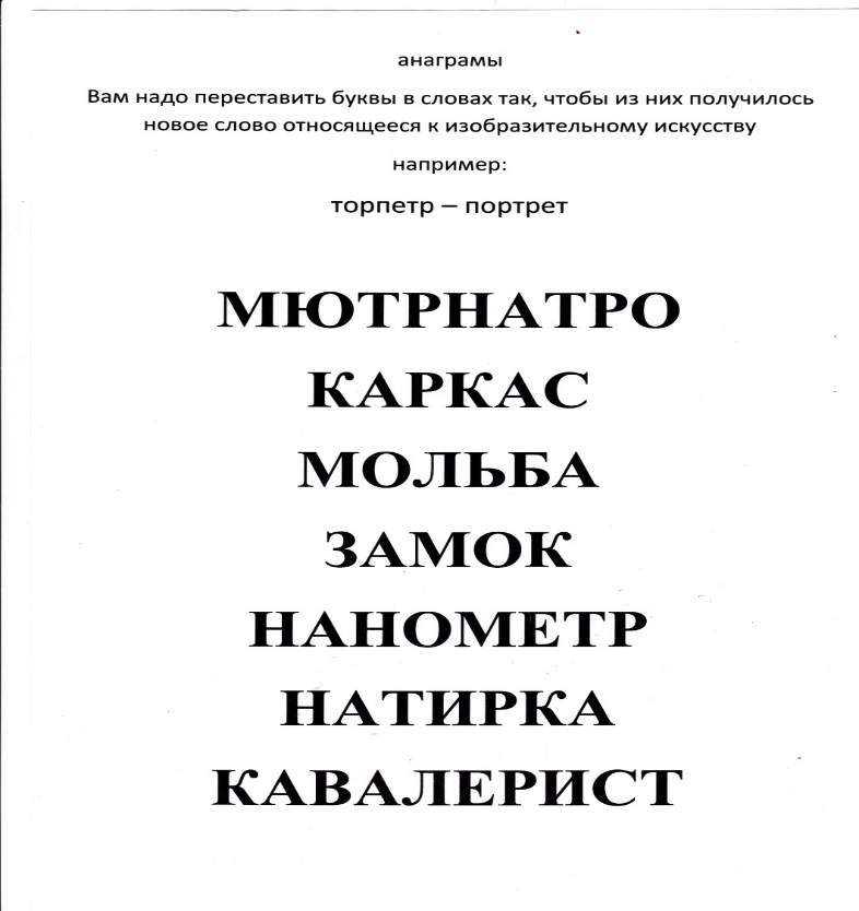 Команды получают карточки с репродукциями картин и листочки с фамилиями художников и названиями картин. За 2 минуты надо подобрать названия к репродукциям.