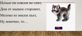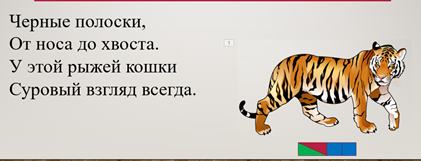3 | Изучение нового материала | Поиск решения проблемы-открытие нового знания. Аналитико-синтетический: звуковой анализ слова, характеристика звука. Наглядный: демонстрация | -Еще раз напомните мне, как тикают часики. Назовите первые звуки в этих словах. Понаблюдайте за язычком. -Значит это согласный или гласный звук? Что вы заметили еще? Что мы учились делать? У кого получилось? Как вы думаете, нам понадобятся помощники на уроке? Они спрятались в загадках: Ночью он совсем не спит, Дом от мышек сторожит, Молоко из миски пьет, Ну конечно, это… КОТ(слайд 6) Черные полоски, От носа до хвоста. У этой рыжей кошки Суровый взгляд всегда. ТИГР(слайд 7)