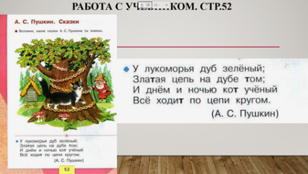 4 | Применение нового знания. Работа с учебником | Фронтальная Словесный: учебный диалог | -Давайте откроем учебник стр.52. 5и2 -Прослушайте отрывок из поэмы А.С.Пушкина «Руслан и Людмила».(читает учитель, дает определение «поэма».) У Лукоморья дуб зеленый; Златая цепь на дубе том; И днем и ночью кот ученый Все ходит по цепи кругом. Поэма- произведение повествовательного или лирического содержания, написанное в стихах. -Ребята, вы помните, как выглядит буква Тт? Давайте вспомним и посмотрим на стр.учебника 53 в правый верхний угол. (слайд 10)
