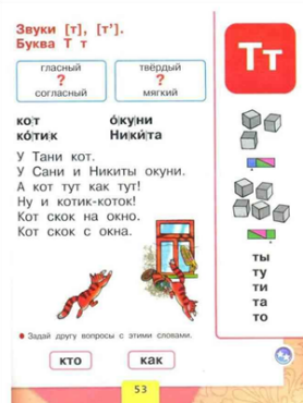 Основные вопросы урока | 1.Как выделять звуки [т], [т’] из речи, правильно его произносить? 2.Как составить схемы слов, в которые входят звуки [т], [т’]? 3.Буква «Т», согласная, глухая, твердая и мягкая? 4.Обучение процессу чтения. 5.Развитие памяти, внимания. | |||