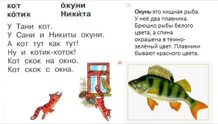 -Перед тем, как прочитать текст, давайте посмотрим на слова, выделенные жирным черным шрифтом. -Ребята, а вы знаете, кто такие окуни? -Давайте посмотрим на иллюстрацию в центре страницы. Кто на ней изображен? -Как вы думаете, что произошло? -Давайте прочитаем. -Как мы можем озаглавить текст? Беседа по содержанию -Чей был кот? -У кого были окуни? -Что сказано про кота? Пересказ текста учащимися. -Как вы думаете, перестанет ли Таня после этого случая любить своего кота? -Как мы должны относиться к животным? | Сначала читают индивидуально Читают хором. Рассматривают и читают слова. Отвечают на вопрос. Узнают новую информацию о рыбе. Выполняют задание. Учимся распознавать букву Т в словах 6 учеников читают по предложению. Озаглавливают текст. Отвечают на вопросы Анализ текста. | 6 | включаться в систему знаний при повторении. | оценивать полученную информацию для ответа на поставленный вопрос. | умение с достаточной точностью выражать свои мысли, умение слушать и понимать речь других. | Практическая работа |