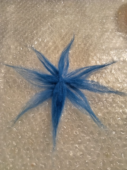 Для изготовления "ромашки" необходимо отделить немного шерсти основного цвета от мотка и разложить пряди в виде пяти или шести конечной звезды. Кончики волокон сразу немного скрутить, сформировав острые краешки.