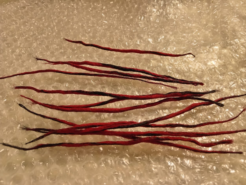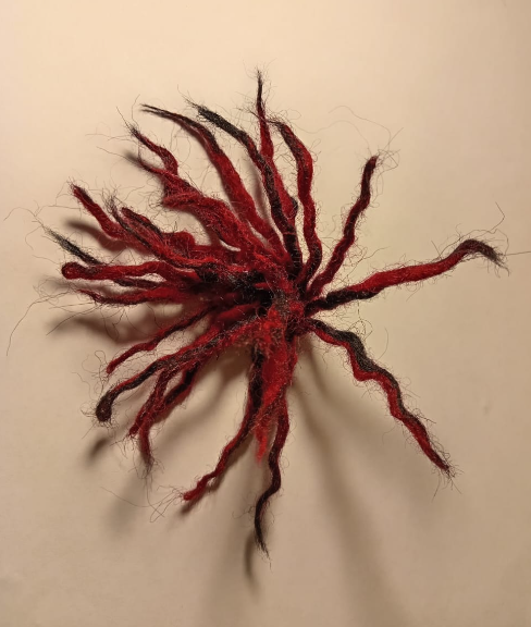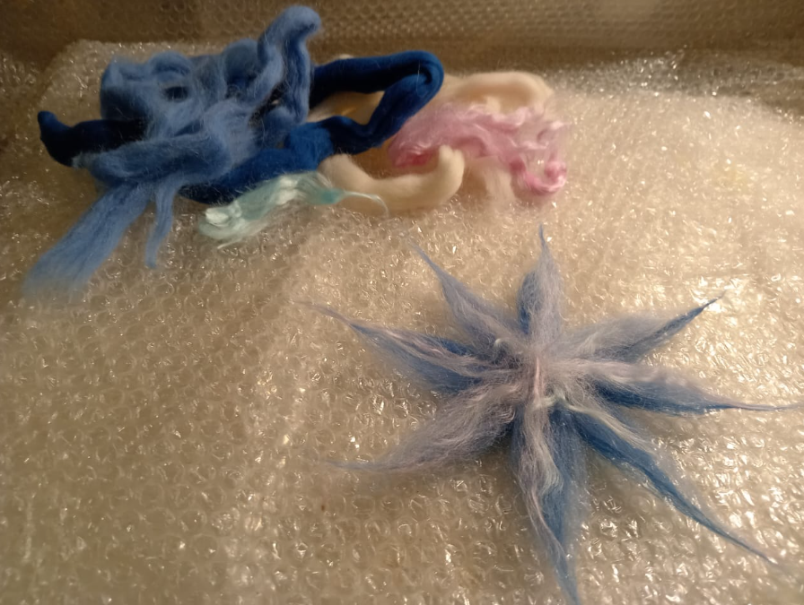 Формируем в руках примерно одинаковые жгуты, которые начинаем катать по пупырчатой пленке, смачивая их мыльным раствором. Особое внимание уделяем кончикам жгутов, дополнительно подкручивая их. Количество жгутов зависит от поставленных задач и от размеров будущего цветка. Для более быстрой увалки можно использовать контрастные ванны изделию, но из-за этого жгуты-лепестки могут получиться более искривленными.