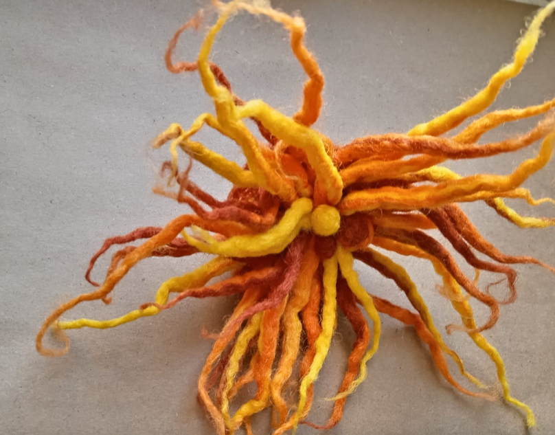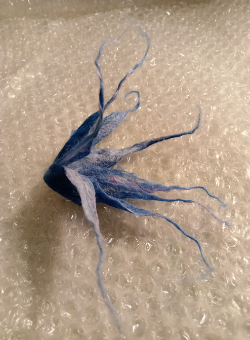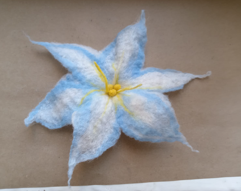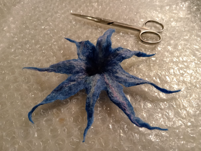Особое внимание уделяем местам соединения отдельных лепестков с серединой и формируем эти моменты при помощи ножниц и валяния. На последнем этапе стараемся плоскому цветку придать некоторую объёмность. Для этого цветок складываем определенным образом и валяем по пузырчатой пленке по столу в таком виде.